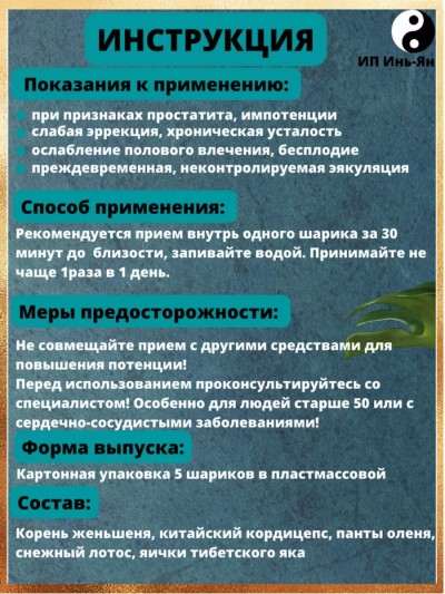Состав: корень женьшеня, китайский кордицепс, панты оленя, снежный лотос, яйчки тибецкого яка.